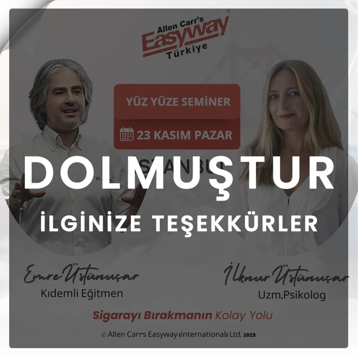 Yan etkisi olabilecek, ilaç, makine, araç kullanmak zorunda kalmadan , bilimsel başarısı kanıtlanmış, Dünya Sağlık Örgütü proje ortağı seçilen Allen Carr semineriyle kurtulun.